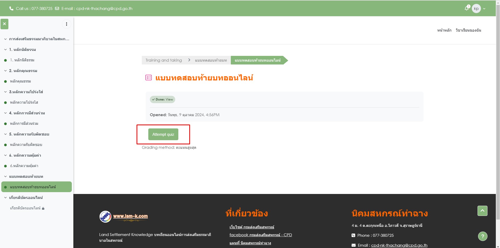 2. (2) เมื่อท่านคลิกเข้าทำแบบทดสอบ จะปรากฏหน้ายืนยันการเข้าทำข้อสอบ ให้ท่านกดปุ่ม "Attempt quiz" www.ex.lsm-k.com คลิก