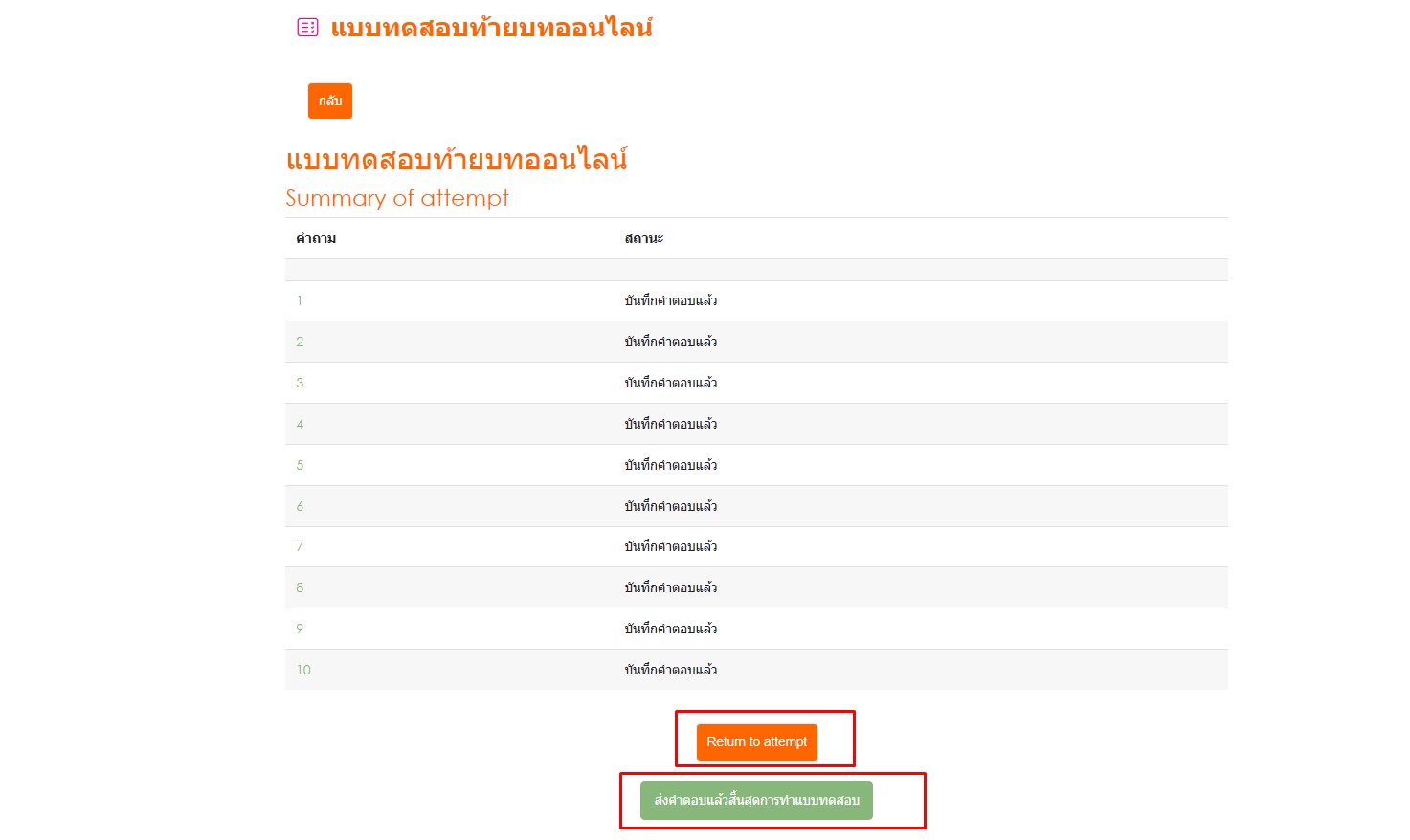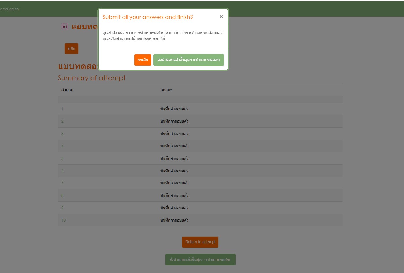 • 3.2 หลังจากนั้นจะมีหน้าต่างสรุปรายละเอียดข้อสอบที่ท่านได้ตอบไปทั้งหมด 10 ข้อ ท่านสามารถ กลับไปแก้ไขข้อสอบได้โดยการกดปุ่ม "Retuen to attempt" หรือ กดปุ่ม "ส่งคำตอบแล้วสิ้นสุดการทำแบบทดสอบ" เพื่อยืนยันการส่งข้อสอบ