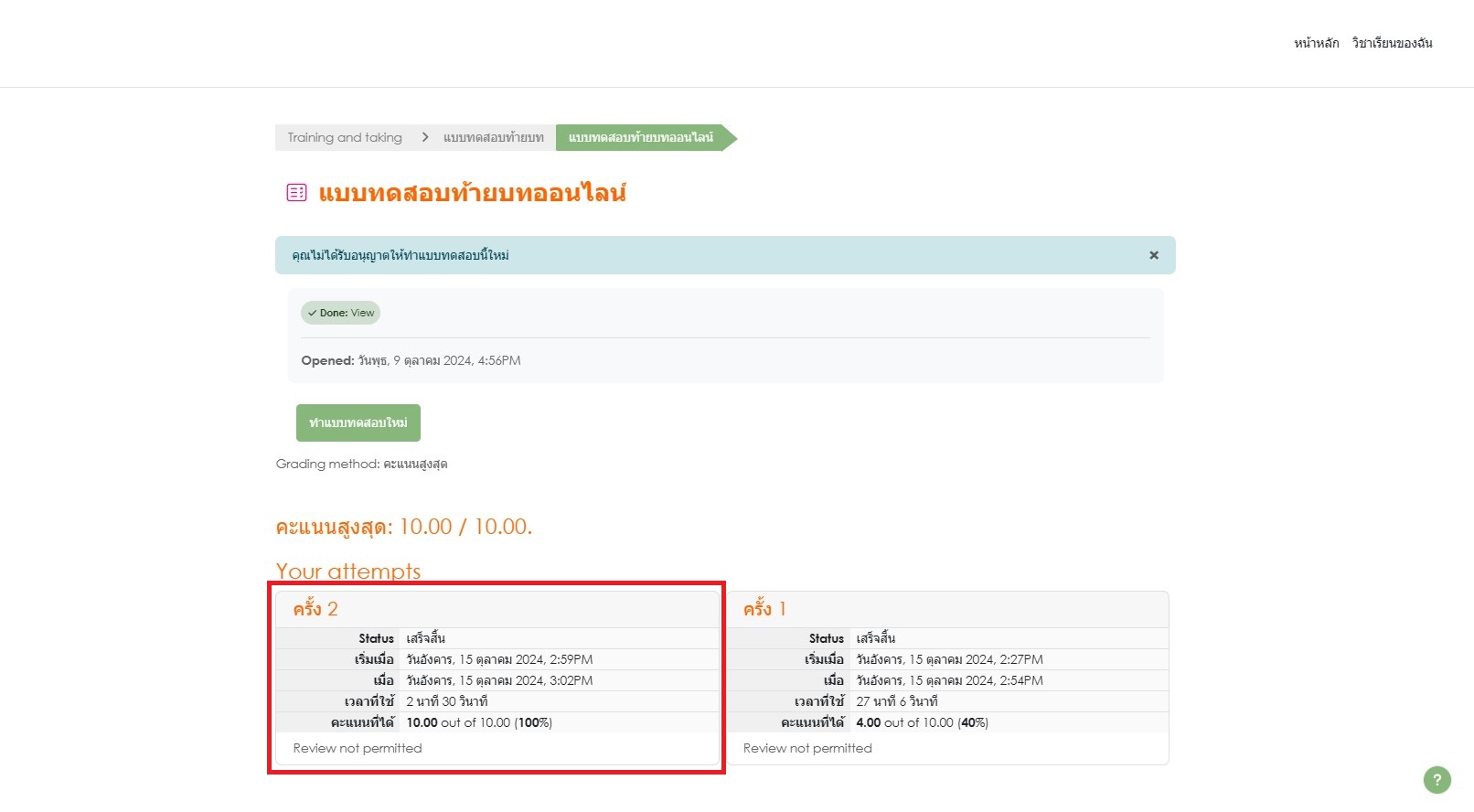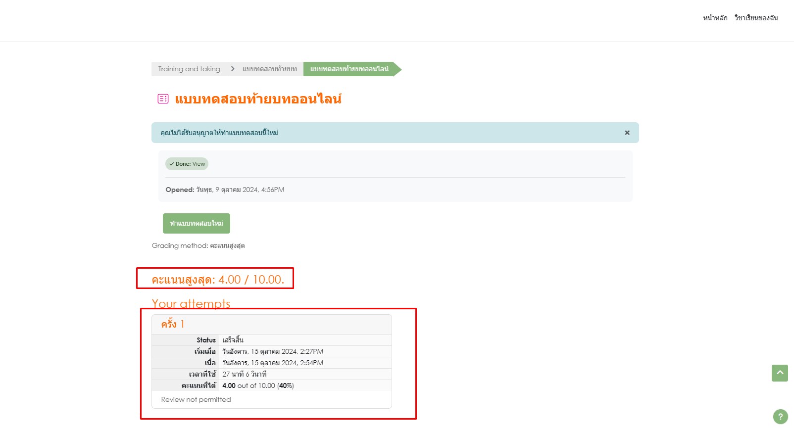 1. (1) กรณีท่านสอบไม่ผ่าน จะปรากฏคะแนนสอบและรายละเอียดการสอบของท่าน หากท่านสอบไม่ผ่าน(เกณฑ์การสอบต้องได้6ข้อขึ้นไปจึงจะผ่าน)ท่านสามารถสอบใหม่จนกว่าจะผ่านได้ โดยการกดปุ่มสีเขียว "เริ่มทำข้อสอบใหม่"