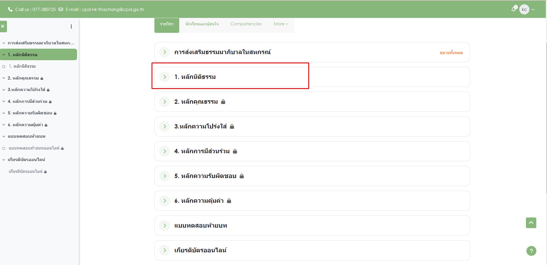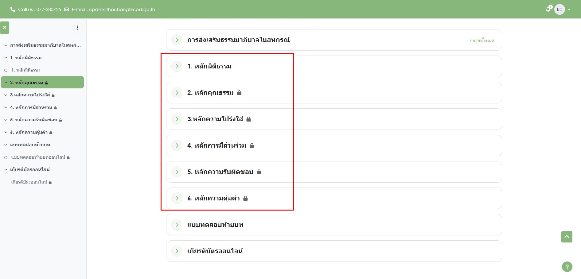 1. (1) 1. หลักนิติธรรม 2. หลักคุณธรรม 3.หลักความโปร่งใส่ 4. หลักการมีส่วนร่วม 5. หลักความรับผิดชอบ 6. หลักความคุ้มค่า โดยท่านสามารถดู VDO เเรกได้คือ VDO หลักนิติธรรม