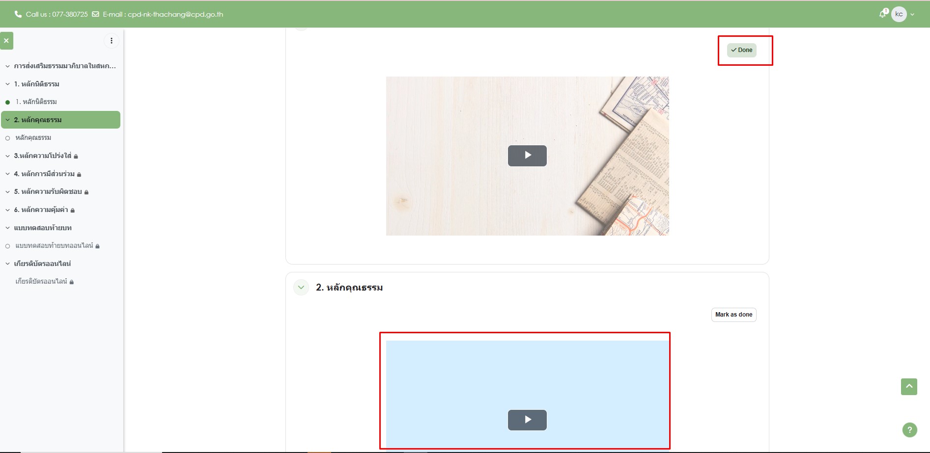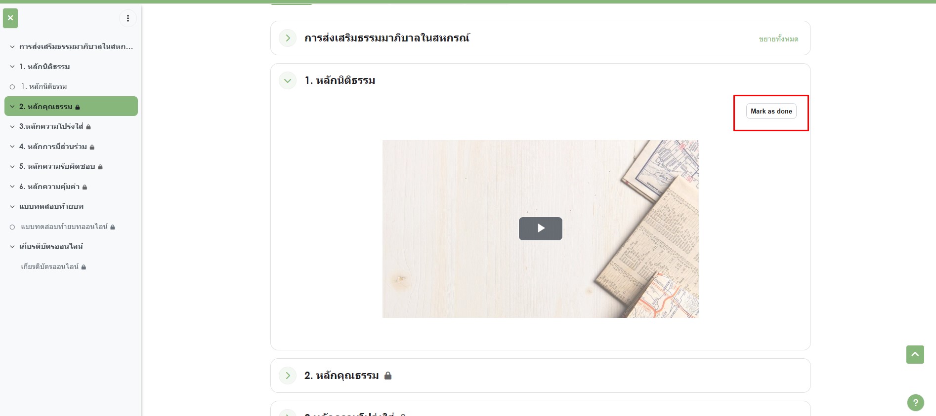 2. (2) เมื่อท่านดู VDO หลักนิติธรรม จบแล้ว ต้องกดปุ่ม "mark as done" จึงจะสามารถดู คลิปถัดไปได้