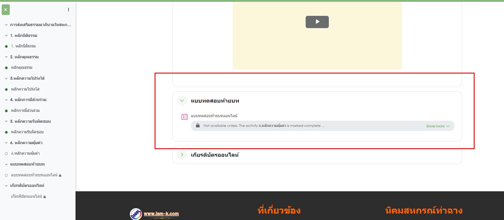 2. (2) หากท่านดูวีดีโอทั้งหมด 6 คลิปและกดปุ่ม "mark as done" ทุก 6 ปุ่มแล้ว(สังเกตุได้จากปุ่มเขียวมีทั้ง6จุด) ท่านจะสามารถเข้าทำแบบทดสอบได้