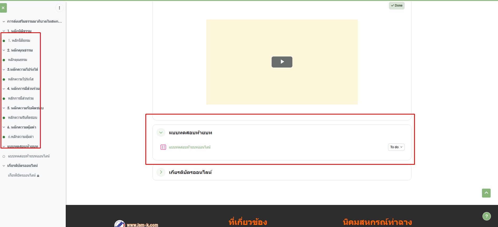 • 4.2 เมื่อดูวีดีโอครบทั้งหมด 6 คลิปและ และท่านกดปุ่ม "mark as done" ทุก 6 คลิปแล้ว ท่านจะสามารถเข้าทำแบบทดสอบได้