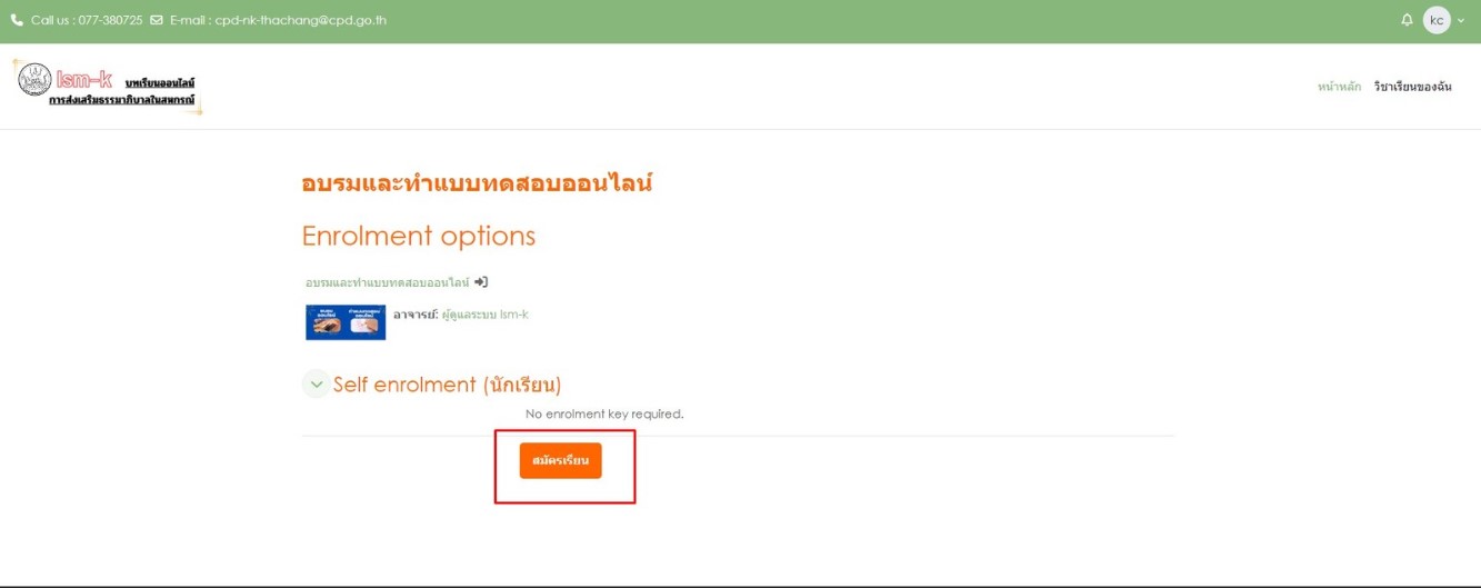 • 3.2 เมื่อท่านยังไม่เคยเข้าสู่การอบรมให้กดปุ่มสมัครเรียน ตามภาพ หากท่านเคยกดสมัครแล้วจะไม่ปรากฏปุ่มให้สมัครอีก